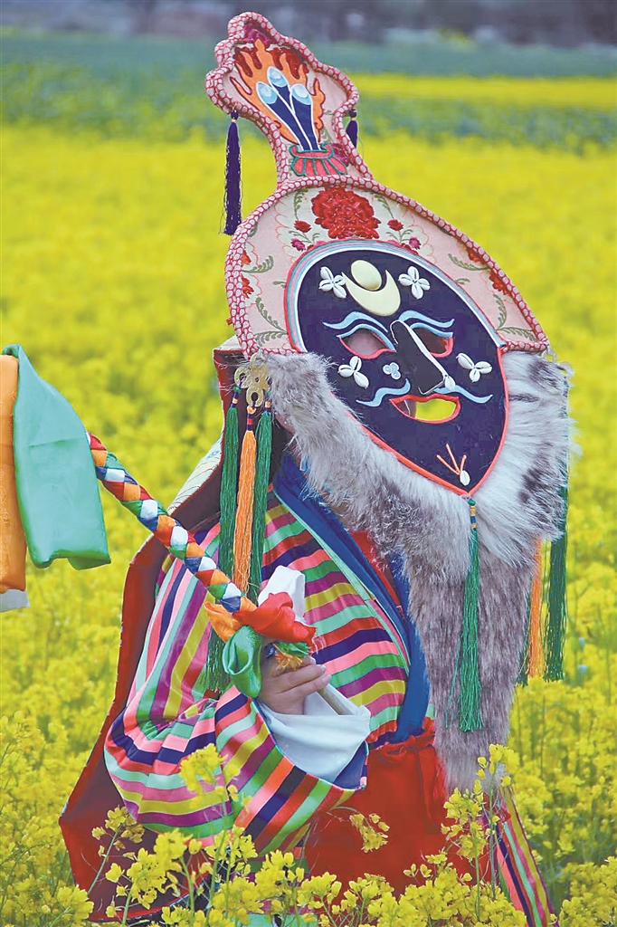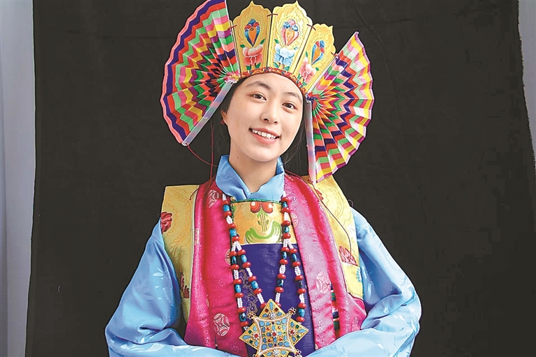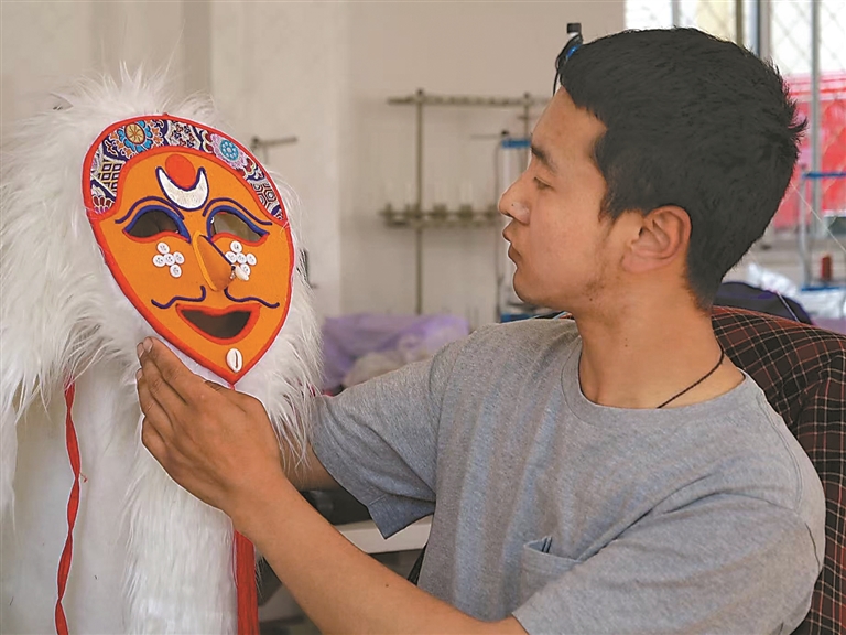 花至少三天時(shí)間制作一個(gè)大的藍(lán)面具,用一周左右制作一套藏戲服裝……在米瑪堅(jiān)才手里,一抹抹絢麗的色彩渲染著角色的命運(yùn),一道道清晰的刻痕勾勒出故事的輪廓。