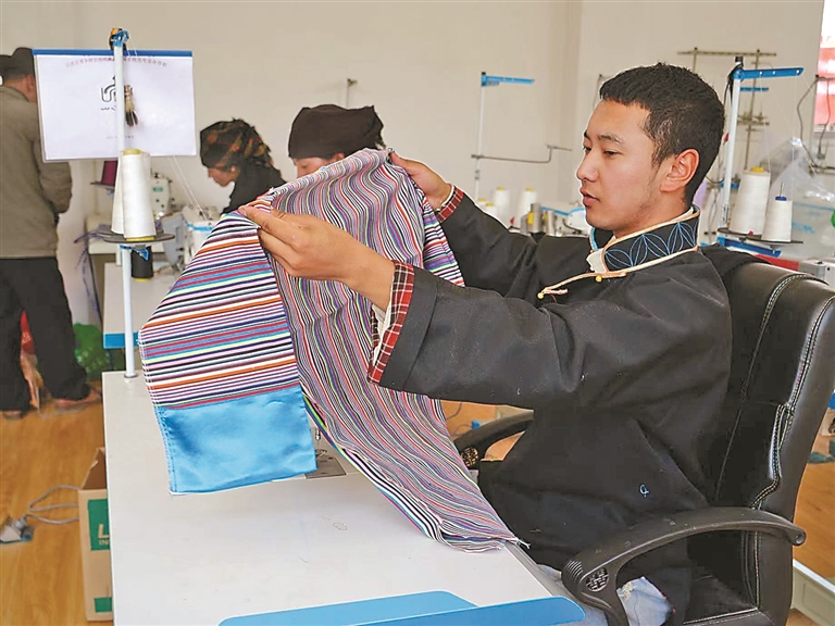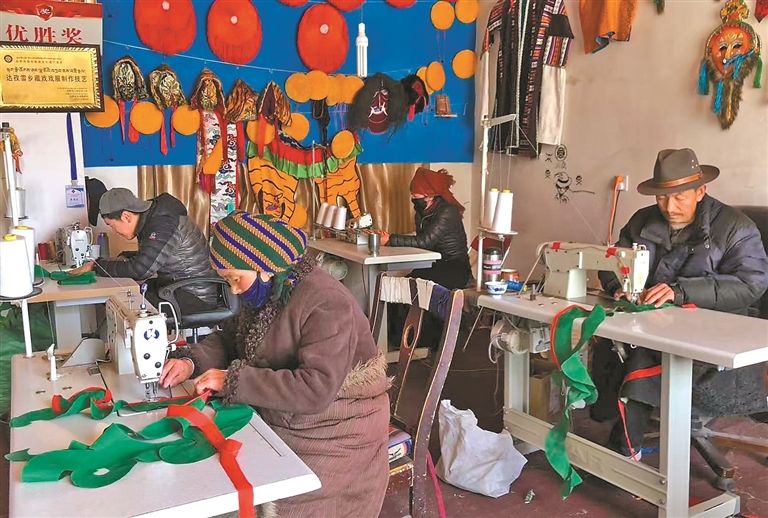 技藝的創(chuàng)新與市場(chǎng)的拓展,也為家鄉(xiāng)的農(nóng)牧民群眾帶來了實(shí)實(shí)在在的收益。始終心系群眾的米瑪堅(jiān)才,系統(tǒng)培訓(xùn)了18名農(nóng)牧民,使他們從零基礎(chǔ)慢慢成長(zhǎng)為熟練掌握藏戲服飾制作技藝的手工藝人,不用背井離鄉(xiāng)就能在家門口掙錢?!耙郧翱糠N地過日子,收入不穩(wěn)定,現(xiàn)在在合作社有固定收入,一年下來能掙3萬多元,顧家掙錢兩不誤,特別知足?!焙献魃绲霓r(nóng)牧民員工談起這份工作,臉上滿是笑意。