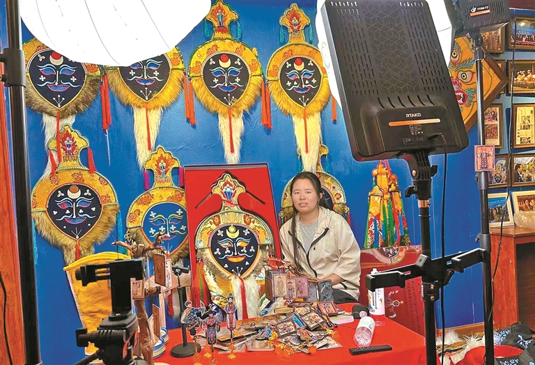 達(dá)孜區(qū)雪鄉(xiāng)阿古傳統(tǒng)藏戲服飾農(nóng)牧民專業(yè)合作社員工通過網(wǎng)絡(luò)直播,拓寬藏戲服飾銷售渠道。