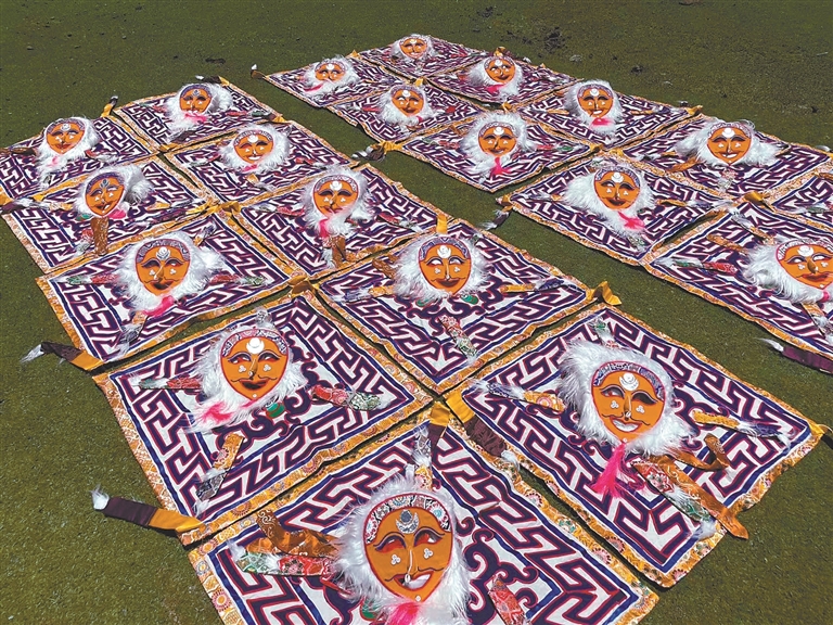 達(dá)孜區(qū)雪鄉(xiāng)阿古傳統(tǒng)藏戲服飾農(nóng)牧民專業(yè)合作社制作的藏戲面具。