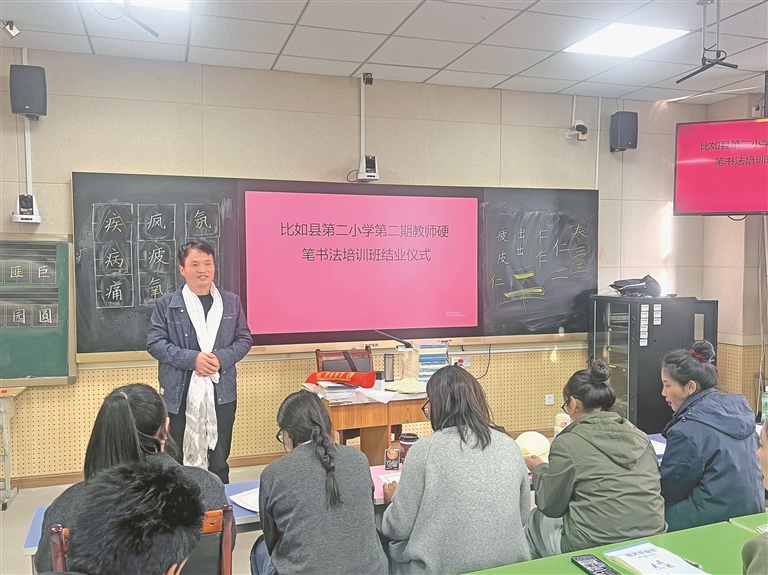 圖為侯華勝為比如縣第二小學第二期教師硬筆書法培訓班結業(yè)寄語。