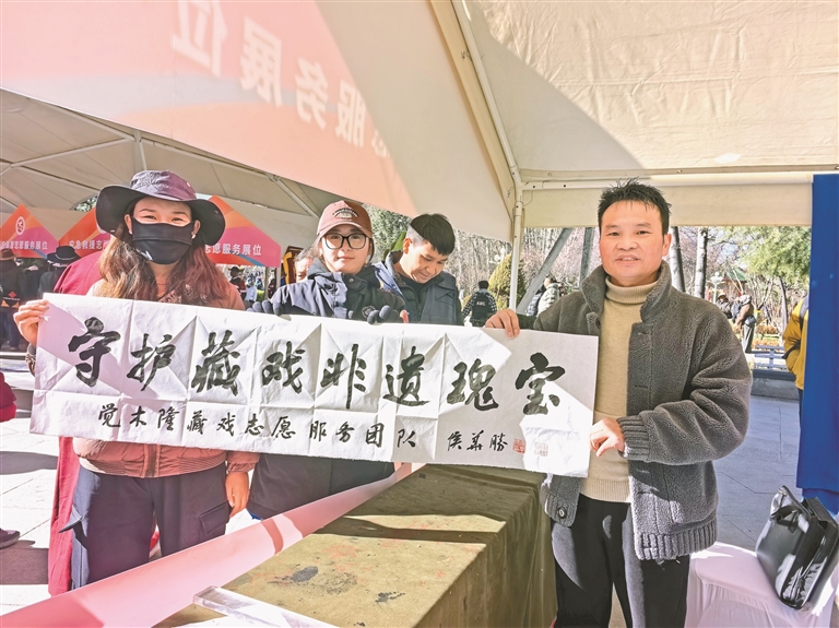 圖為侯華勝為覺木隆藏戲志愿者團隊贈送書法作品。