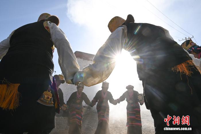 圖為達普天文觀測臺年度觀測活動現場,村民著盛裝載歌載舞。中新社記者 貢嘎來松 攝
