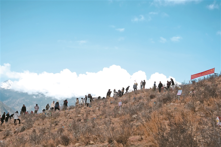 林芝市巴宜區(qū)區(qū)直各部門干部職工、消防指戰(zhàn)員及群眾在林芝鎮(zhèn)嘎拉村生態(tài)修復項目區(qū)的山坡上,遍植1100余株光核桃樹、杏梅樹。記者 謝筱純 攝