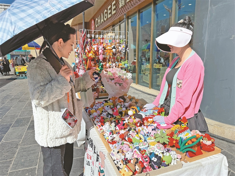 4月初,拉薩天海國際廣場(chǎng)的街頭,一輛擺滿鉤織好物的小推車總引得行人駐足。軟萌的玩偶、實(shí)用的杯墊、精致的酥油茶杯套……件件手作皆藏匠心,攤主林楊陽和她的學(xué)員,便是這些指尖好物的創(chuàng)造者。