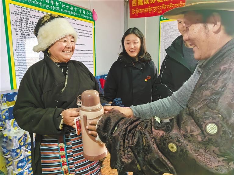圖為那曲市色尼區(qū)那曲鎮(zhèn)色尼雄塔村村民斯秋多杰(左一)用積分兌換商品。 記者 萬(wàn)靖 攝
