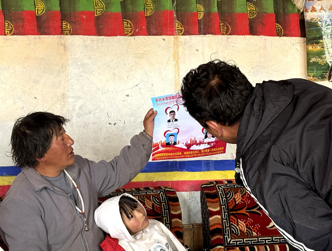 圖為駐村工作隊員弟古(右一)正在向珠扎介紹駐村工作隊便民聯(lián)系卡內(nèi)容。
