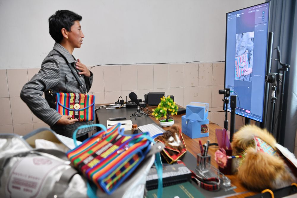 倉秋多吉通過網(wǎng)絡(luò)銷售當(dāng)?shù)氐漠a(chǎn)品(8月24日攝)。