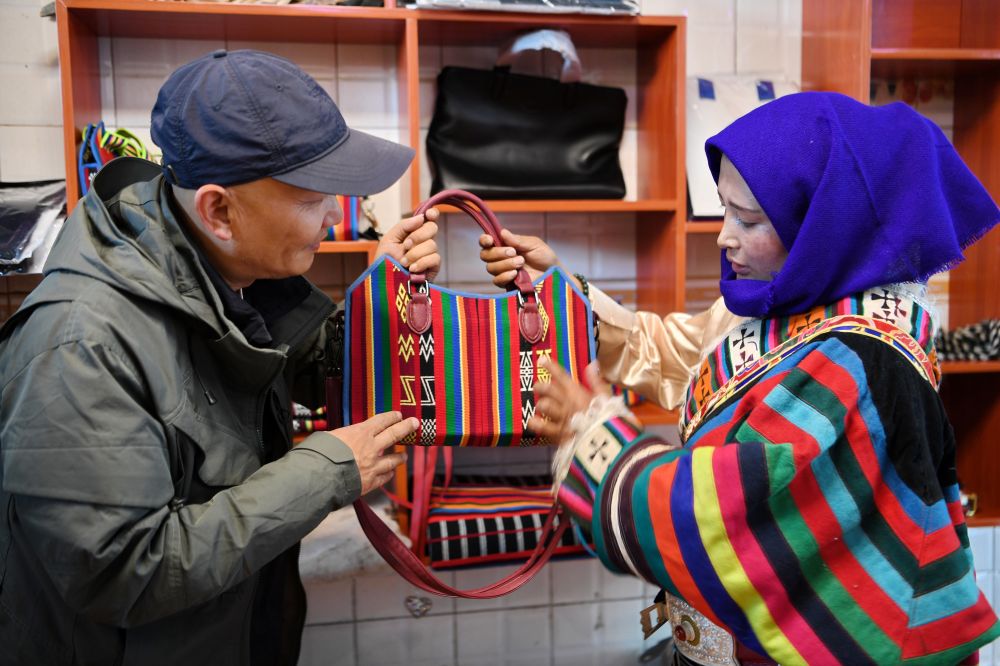 一名來自上海的游客(左)在安多托尕爾倉游牧產(chǎn)業(yè)有限責(zé)任公司展廳挑選產(chǎn)品(8月24日攝)。