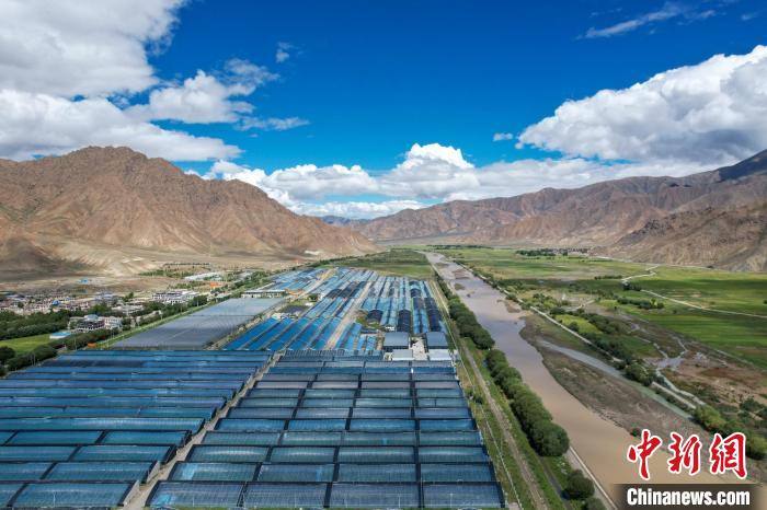 經(jīng)過近三十年的發(fā)展,西藏白朗縣大棚蔬菜產(chǎn)業(yè)已具規(guī)模。圖為航拍白朗縣年楚河畔的大棚設施。記者 江飛波 攝