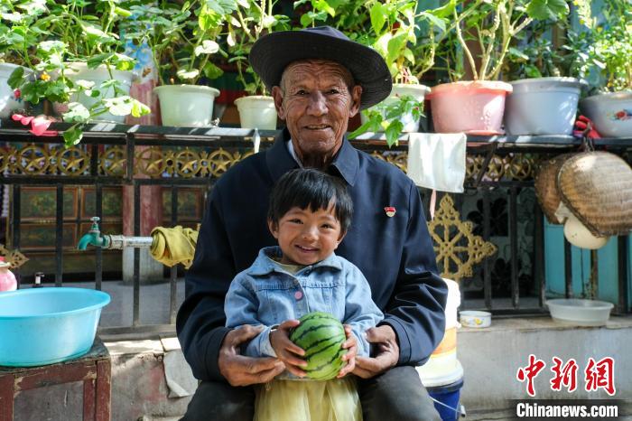 現(xiàn)年77歲的邊巴頓珠是彭倉村種大棚“第一人”。圖為8月23日,邊巴頓珠和孫女抱著一個自家種出來的大棚西瓜。記者 江飛波 攝