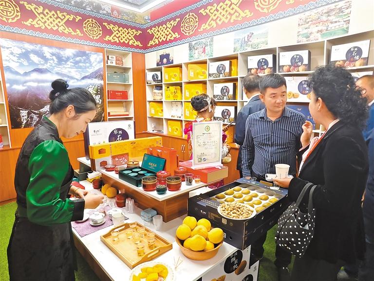 察隅縣供銷合作社工作人員向群眾推銷察隅花生和黃桃、獼猴桃等農(nóng)特產(chǎn)品。