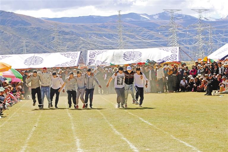 圖為農(nóng)牧民參加三人兩足比賽。 本報記者 旦增嘎瓦 攝
