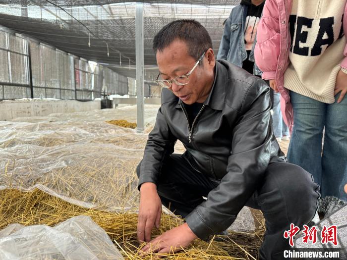 圖為王剛介紹高原有機赤松茸種植基地內的情況。陳宗淇 攝