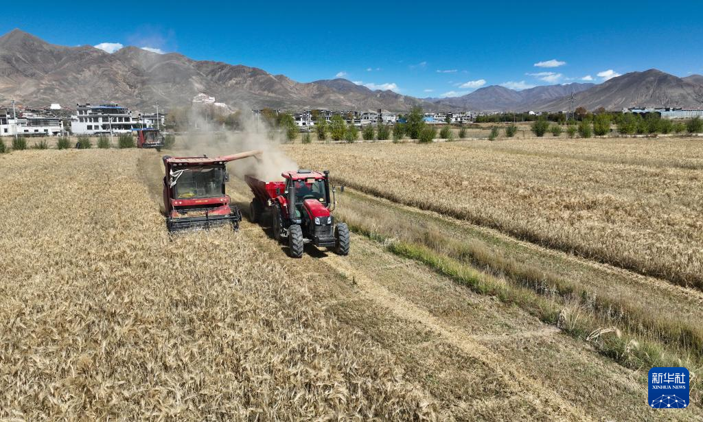 西藏日喀則市江孜縣江熱鄉(xiāng)班覺倫布村農(nóng)機(jī)服務(wù)農(nóng)民專業(yè)合作社的社員使用農(nóng)機(jī)收獲青稞(10月16日攝)。新華社記者 晉美多吉 攝