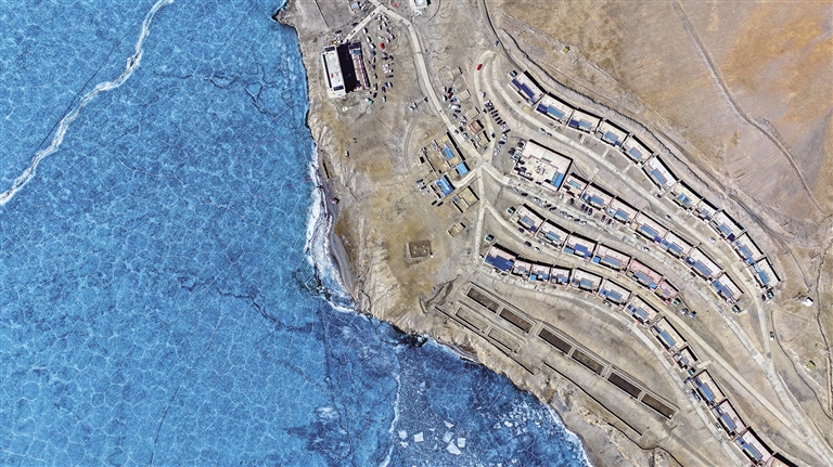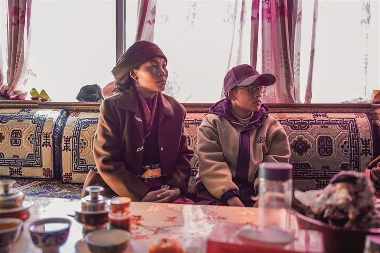 當(dāng)日,天空晴朗,在廣袤無垠、無樹木遮擋的曠野上,稍起一陣疾風(fēng),便會揚起一層薄薄的黃沙。從村委會出發(fā),沿著冰湖畔的水泥小路前行,很快就來到了村民倫珠曲珍的家。一進(jìn)屋,厚實的木門便將凜冽的寒風(fēng)擋在了門外?!翱煺堖M(jìn),這幾天風(fēng)沙有點大,普莫雍措都沒以前藍(lán)了。”倫珠曲珍一邊關(guān)門一邊熱情地笑著說道。