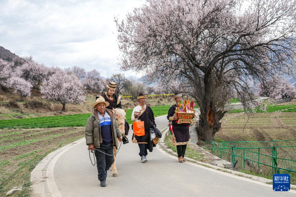 4月3日,林芝市朵當(dāng)村群眾身著盛裝、手捧切瑪為游客提供民俗體驗(yàn)活動(dòng)。新華社記者 丁增尼達(dá) 攝