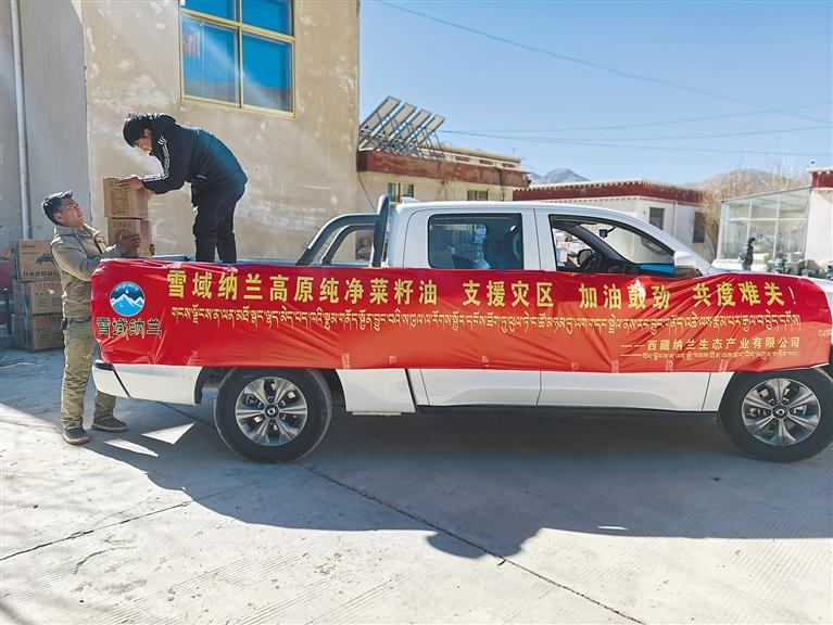 今年1月,西藏納蘭生態(tài)產(chǎn)業(yè)有限公司運(yùn)送菜籽油支援定日縣地震災(zāi)區(qū)。