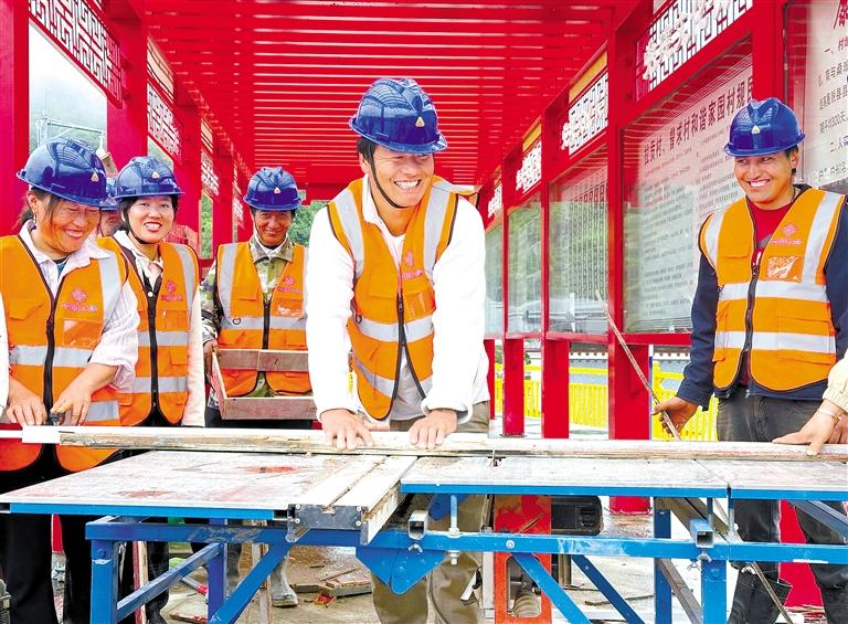 圖為村莊基礎設施提升項目現(xiàn)場,曾求村村民在加工木材。記者 旦增蘭澤 通訊員 朗玲 攝