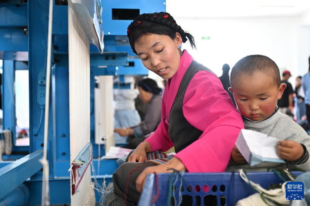 7月18日,江孜藏毯文化發(fā)展有限責(zé)任公司的員工次仁卓瑪帶著兒子在生產(chǎn)車(chē)間內(nèi)編織藏毯。新華社記者 李鑫 攝