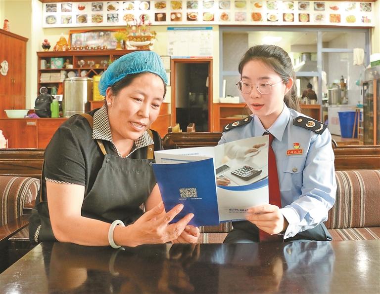圖為稅務(wù)局工作人員為甜茶館經(jīng)營(yíng)者講解線上開(kāi)發(fā)票操作指南。