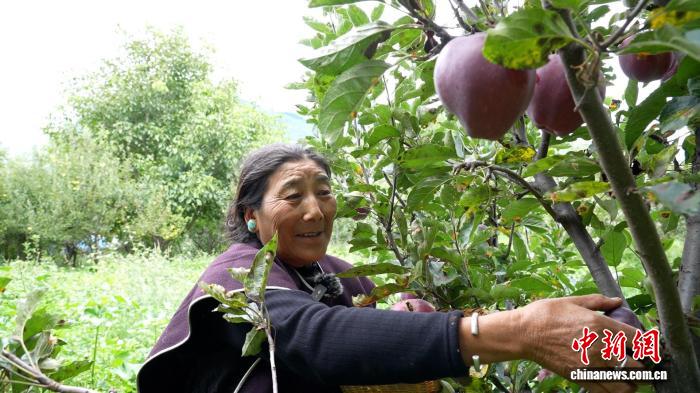 圖為米林市崗嘎村村民白瑪在摘自家種的蘋(píng)果。德吉 攝