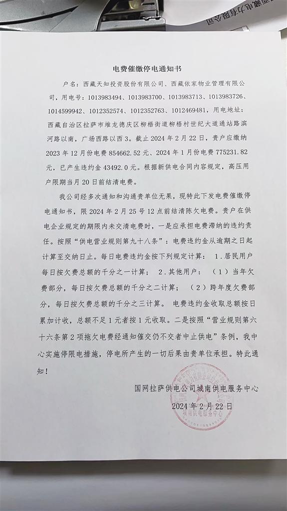 記者從國(guó)網(wǎng)拉薩供電公司城南供電服務(wù)中心了解到,上述5個(gè)小區(qū)均由同一家物業(yè)公司負(fù)責(zé)代收電費(fèi),2024年1月份、2月份的電費(fèi)皆未繳納,涉及電費(fèi)逾百萬(wàn)元。供電公司于2月份、3月份連續(xù)向該物業(yè)公司發(fā)布《電費(fèi)催繳停電通知書》,通知書明確:“請(qǐng)您在接到本通知后,務(wù)必于最后繳費(fèi)日期2024年3月31日12:30之前,前往我公司指定的繳費(fèi)地點(diǎn)或通過(guò)網(wǎng)絡(luò)平臺(tái)完成電費(fèi)繳納工作。逾期未繳,2024年3月31日13:00采取停限電措施,所產(chǎn)生的一切后果由貴單位承擔(dān)?!钡刂?月31日12:30,該物業(yè)公司仍未繳費(fèi),才導(dǎo)致了小區(qū)被斷電。
