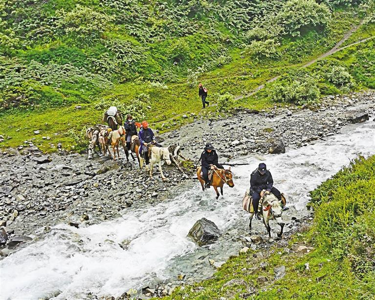 圖為貢當(dāng)邊境派出所民警騎馬護(hù)送村民及物資前往冬蟲夏草采挖區(qū)。西藏日報記者 張宇 通訊員 季馨 攝