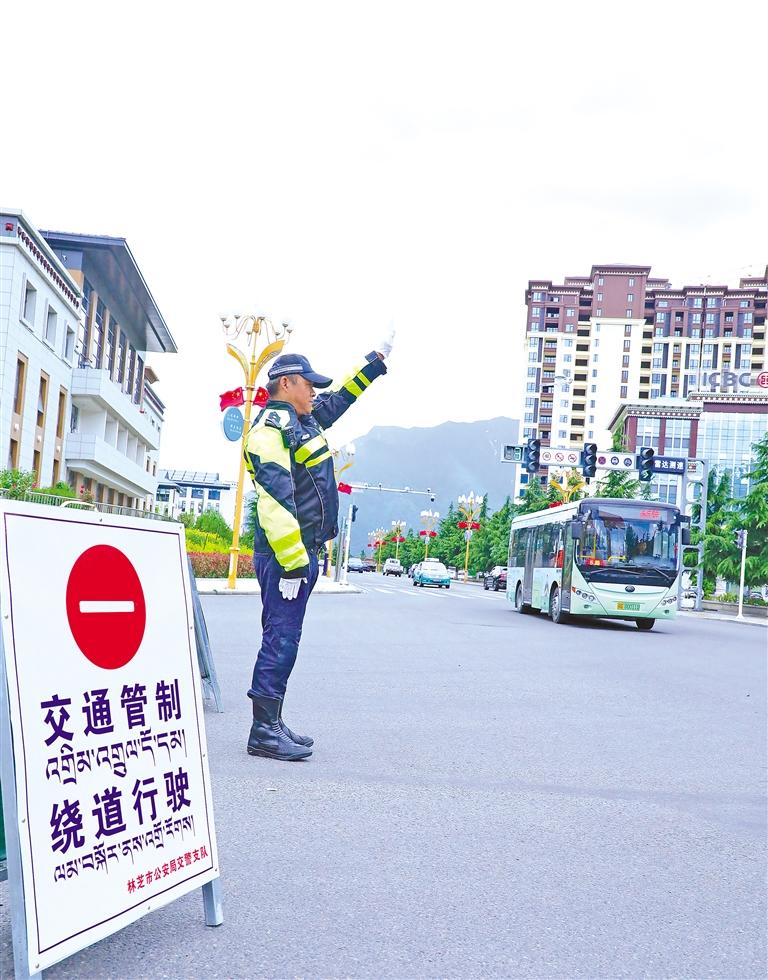圖為林芝市公安交警在考場(chǎng)周圍指揮交通,維護(hù)安全有序的考場(chǎng)周邊交通環(huán)境。