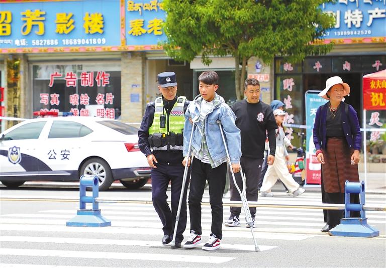 圖為林芝市公安民警幫助行動(dòng)有困難的考生順利到達(dá)考場(chǎng)。