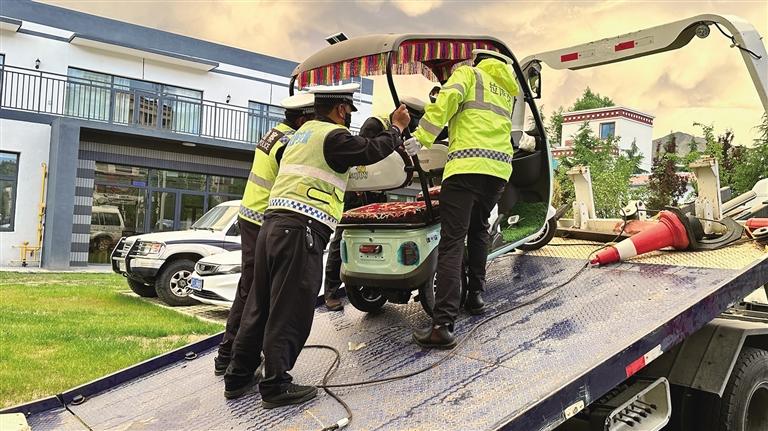 6月19日18時許,記者來到拉薩市城關(guān)區(qū)江蘇東路與嘎瑪貢桑路交叉口,此時正值下班高峰期,各類車輛川流不息,十分繁忙,拉薩市公安局交警支隊城南大隊的民警們一邊疏導(dǎo)交通,一邊開展電動三輪、四輪車專項整治行動。沒過多久,一輛電動三輪車準備通過路口,民警丹增發(fā)現(xiàn)該車輛存在非法改裝現(xiàn)象,便立即上前將車輛引導(dǎo)至安全位置,檢查后發(fā)現(xiàn)駕駛?cè)怂阶詾檐囕v加裝遮陽篷,上路行駛存在較大安全隱患,便按照相關(guān)法律法規(guī)暫扣車輛。丹增告訴記者:“我們會將暫扣的車輛統(tǒng)一停放,等駕駛?cè)私邮芴幜P并提交相關(guān)資料后,才能領(lǐng)回車輛?!?/p>