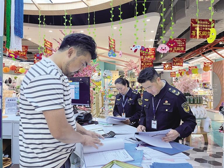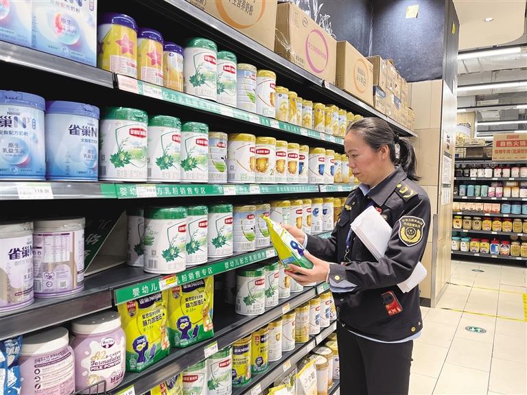 執(zhí)法人員對永輝超市(城關(guān)萬達(dá)廣場店)嬰幼兒配方乳粉進(jìn)行檢查。