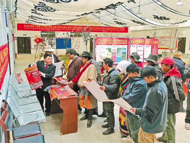 那曲市雙湖縣措折羅瑪鎮(zhèn)第三屆“鄉(xiāng)村振興 那曲奮進”活動中,法庭干警(左一)向群眾進行普法宣傳。(圖片均由記者彭琦 攝)