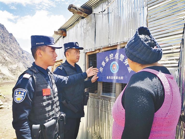 金東邊境派出所民警為群眾介紹蟲(chóng)草采挖點(diǎn)警務(wù)室職能。 (本文配圖由通訊員 張力 記者 謝筱純 王珊 攝)