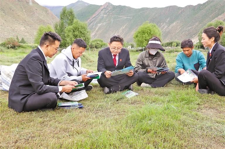 圖為山南市桑日縣人民法院干警在田間地頭為群眾宣傳法律知識(shí)。 記者 巴桑旺姆 攝