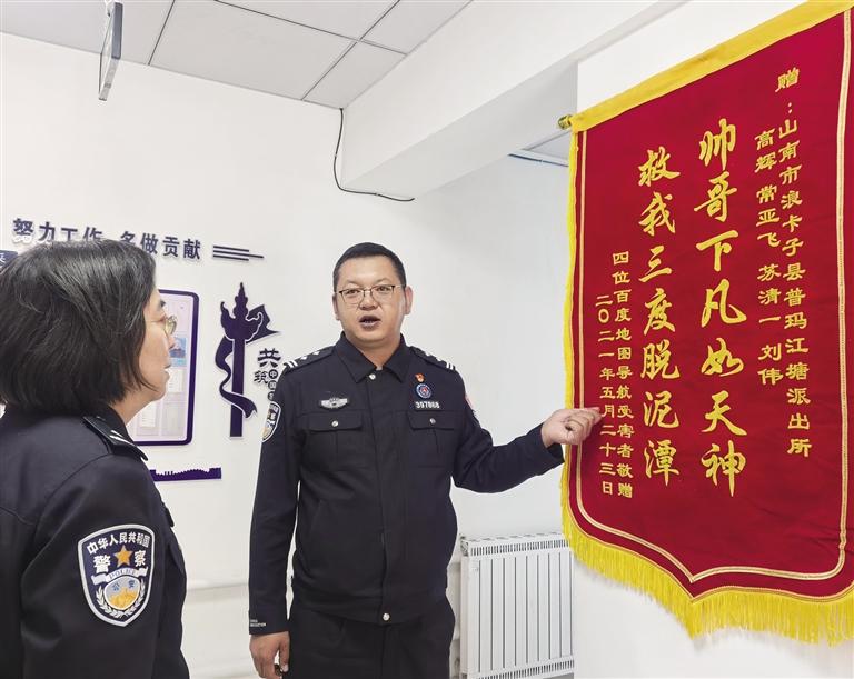 “帥哥下凡如天神,救我三度脫泥潭!”如果錦旗有生命,憑借這兩行字,它無疑會成為最引人注目的那一個。這面特別的錦旗存放在山南市邊境管理支隊普瑪江塘邊境派出所的榮譽室里。2021年5月,普瑪江塘邊境派出所接到求助電話,稱4名游客駕車前往崗布冰川被困沼澤,亟待救援。接警后,民警迅速到達現(xiàn)場進行救援。游客脫險后千恩萬謝,與民警互留電話。民警叮囑他們趕緊離開,不要再去冰川了。然而走了還不到5分鐘,民警又接到電話,稱他們再次駕車陷入泥沼動彈不得。警車原路返回,進行救援。然而民警剛離開10分鐘,再次接到了游客電話:“警官,非常不好意思,我們又陷進去了還得麻煩你們再回來一趟?!庇谑牵@面“救我三度脫泥潭”的錦旗便誕生了。