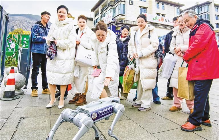 據(jù)了解,林芝市啟用銀灰色人工智能機器狗GO2作為移動普法載體,搭載自主巡航、動態(tài)避障等6項智能功能,在工布天街商圈開展全天候動態(tài)巡游。機器狗背部印制民法典專題二維碼矩陣,同步連接“法治林芝”抖音號、“林芝司法為民”微信公眾號、林芝掌上12348平臺等4個線上端口,實現(xiàn)群眾學法“碼上達”,迅速觸及案例解析、法律問答、維權指引等9類服務模塊。