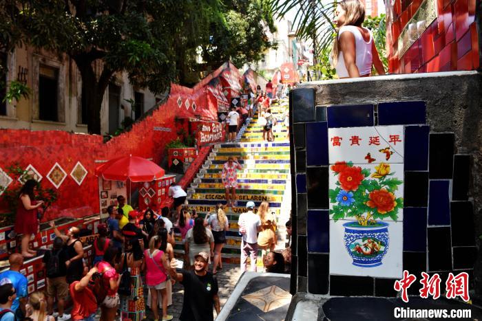 跟隨里約熱內(nèi)盧共和國博物館研究員安德烈·安迪·安古洛,中新社記者來到里約熱內(nèi)盧聞名遐邇的城市地標——塞拉隆階梯。這是由智利藝術(shù)家塞拉隆歷時20余年打造的“彩色階梯”。