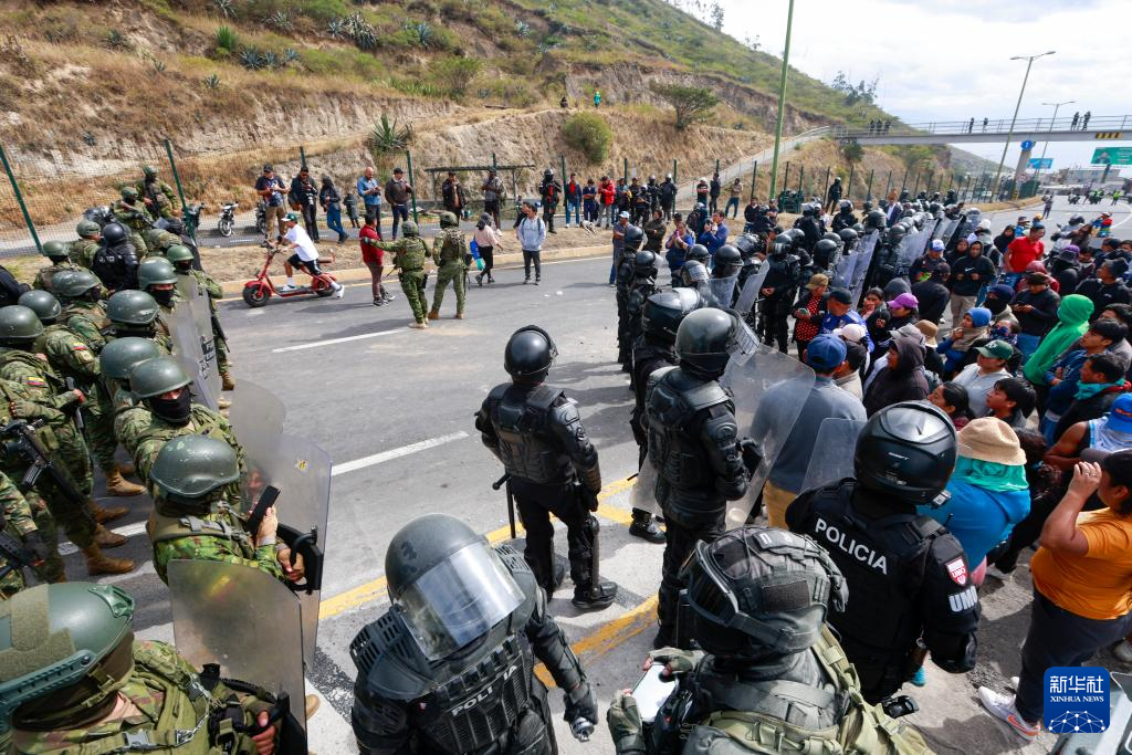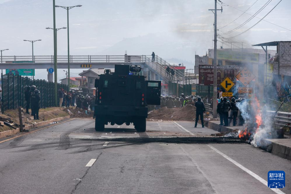 9月16日,在厄瓜多爾首都基多,武裝部隊(duì)人員在公路旁維持秩序。新華社發(fā)(里卡多·蘭德塔攝)
