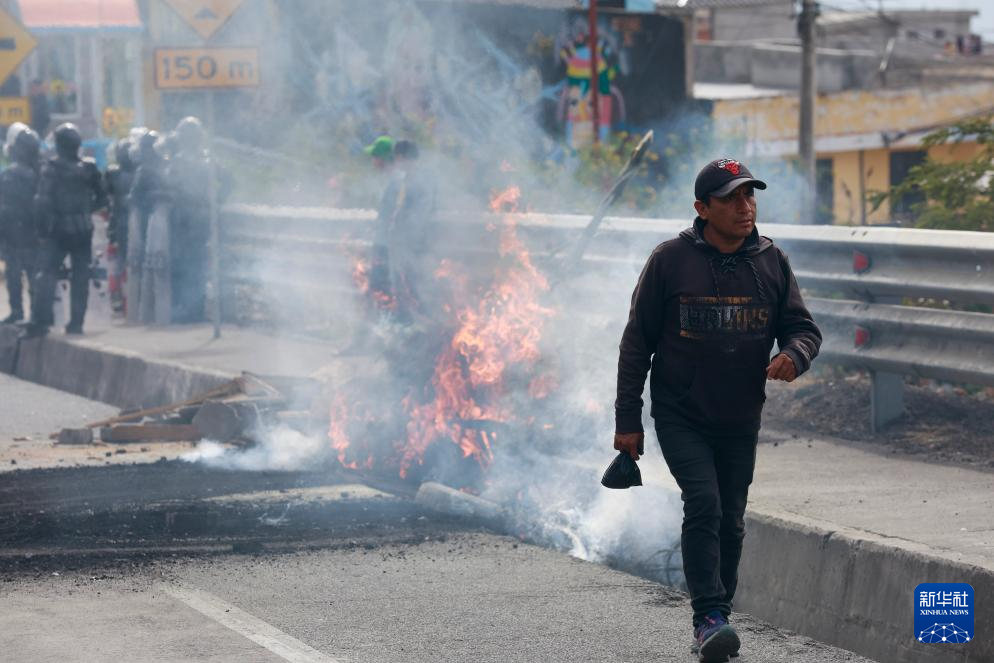9月16日,在厄瓜多爾首都基多,一名路人經(jīng)過(guò)示威者點(diǎn)燃的路障。新華社發(fā)(里卡多·蘭德塔攝)