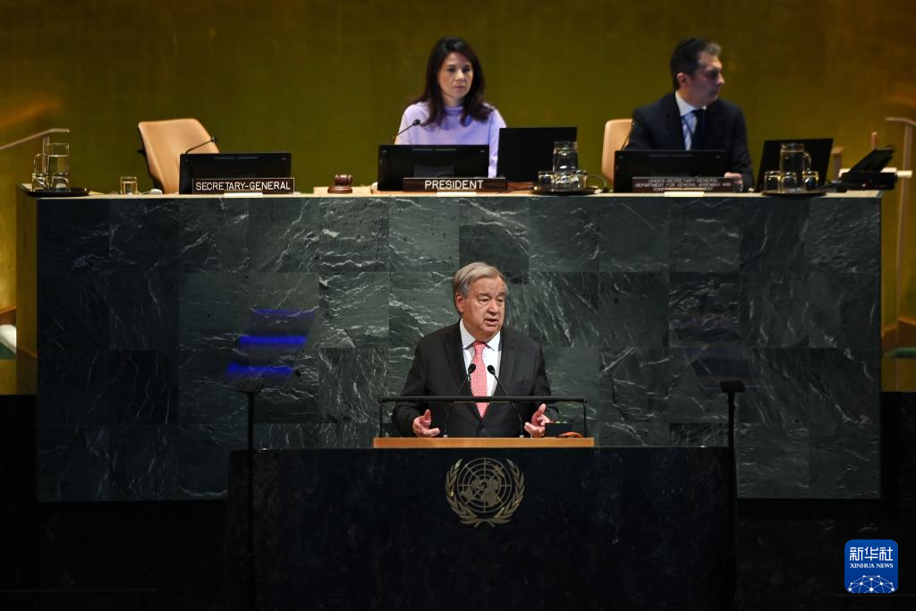 9月22日,在位于紐約的聯(lián)合國總部,聯(lián)合國秘書長安東尼奧·古特雷斯(前)在紀念聯(lián)合國成立80周年高級別會議上講話。新華社記者 吳曉凌 攝