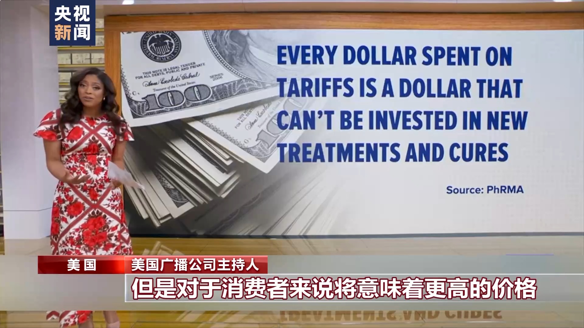 美國(guó)廣播公司主持人:美國(guó)藥物研究機(jī)構(gòu)和制藥廠商協(xié)會(huì)指出,在關(guān)稅上多花的每一美元,都無(wú)法用于投資新治療方法的開(kāi)發(fā)。政府說(shuō)加關(guān)稅是為了國(guó)家安全、為了提振美國(guó)制造業(yè),但是對(duì)于消費(fèi)者來(lái)說(shuō),將意味著更高的價(jià)格。