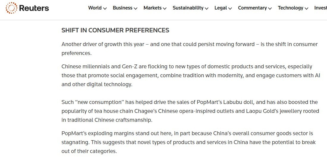 作者認(rèn)為,中國經(jīng)濟增長的另一個驅(qū)動力是消費者偏好的轉(zhuǎn)變。中國千禧一代和 Z 世代正涌向新型國內(nèi)產(chǎn)品和服務(wù),那些可以促進社會參與、將傳統(tǒng)與現(xiàn)代相結(jié)合、并通過人工智能和其他數(shù)字技術(shù)吸引客戶的產(chǎn)品和服務(wù)尤其受到歡迎,這種“新消費”推動了泡泡瑪特拉布布娃娃的銷售,也提升了茶館連鎖店“霸王茶姬”的中國戲曲主題門店和一些源于中國傳統(tǒng)工藝的珠寶的知名度,不僅如此,這些新興的產(chǎn)品和服務(wù)類型還具備潛力,能夠突破現(xiàn)有類別。