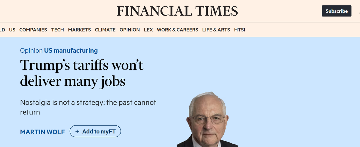 英國《金融時報(bào)》副總編及首席經(jīng)濟(jì)評論員馬丁·沃爾夫(Martin Wolf)8日發(fā)表評論文章稱,事實(shí)表明,特朗普政府推行的貿(mào)易保護(hù)主義政策,并未兌現(xiàn)其對選民所作的核心承諾——為美國創(chuàng)造大量制造業(yè)就業(yè)崗位,尤其是面向那些曾經(jīng)依賴傳統(tǒng)工業(yè)、如今卻面臨地區(qū)經(jīng)濟(jì)衰落困境的工人群體。他進(jìn)一步指出,這一承諾本質(zhì)上是空洞的,其政策實(shí)質(zhì)是為政府自身及其背后的富豪階層牟取利益。