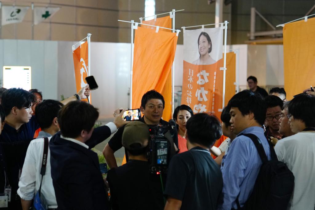7月13日,在日本千葉縣,參政黨黨首神谷宗幣(中)在街頭演說(shuō)活動(dòng)后接受媒體采訪。新華社記者賈浩成攝