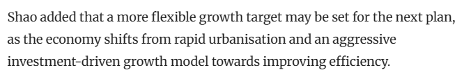 《南華早報》援引分析人士的表述認(rèn)為,隨著中國經(jīng)濟從快速城鎮(zhèn)化和投資驅(qū)動型增長模式轉(zhuǎn)向高質(zhì)量發(fā)展,中國下一個五年規(guī)劃可能會設(shè)定更靈活的增長目標(biāo)。