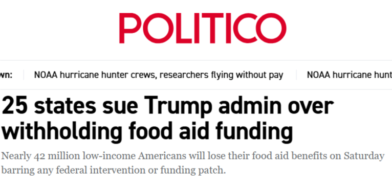 據(jù)美國《政治報》網(wǎng)站報道,受政府持續(xù)“停擺”影響,美農(nóng)業(yè)部宣布暫停其“補(bǔ)充營養(yǎng)援助計劃”(SNAP),11月1日起停止發(fā)放食品救濟(jì)。目前這一項目覆蓋約4200萬人,約占美國總?cè)丝诎朔种?,其中多?shù)為低收入群體和殘障人士。SNAP項目暫停后,他們的生活將難以為繼。當(dāng)?shù)貢r間28日,民主黨主政的25個州和首都華盛頓對聯(lián)邦政府提起訴訟,要求動用聯(lián)邦應(yīng)急資金,以維持這一項目。