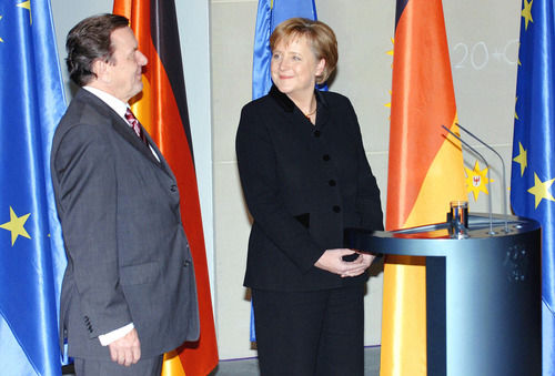 2005年11月22日,在德國首都柏林,德國新總理默克爾(右)與卸任的前總理施羅德(左)在總理府舉行交接儀式。(吳曉凌攝)