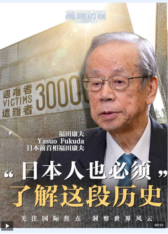 日本前首相福田康夫曾在2018年參觀侵華日軍南京大屠殺遇難同胞紀(jì)念館,他是第四位參觀的日本前首相。接受總臺(tái)《高端訪談》專訪時(shí),他說,日本人也必須了解這段歷史。