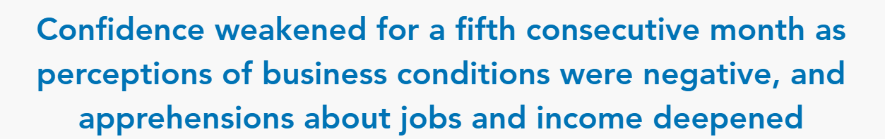 美國(guó)研究機(jī)構(gòu)世界大型企業(yè)研究會(huì)12月23日發(fā)布的初步調(diào)查數(shù)據(jù)顯示,由于對(duì)商業(yè)環(huán)境看法負(fù)面,對(duì)就業(yè)和收入的擔(dān)憂加劇,美國(guó)12月份消費(fèi)者信心指數(shù)從11月份修訂后的92.9進(jìn)一步下滑至89.1,連續(xù)第五個(gè)月走低,為今年4月以來的最低水平。